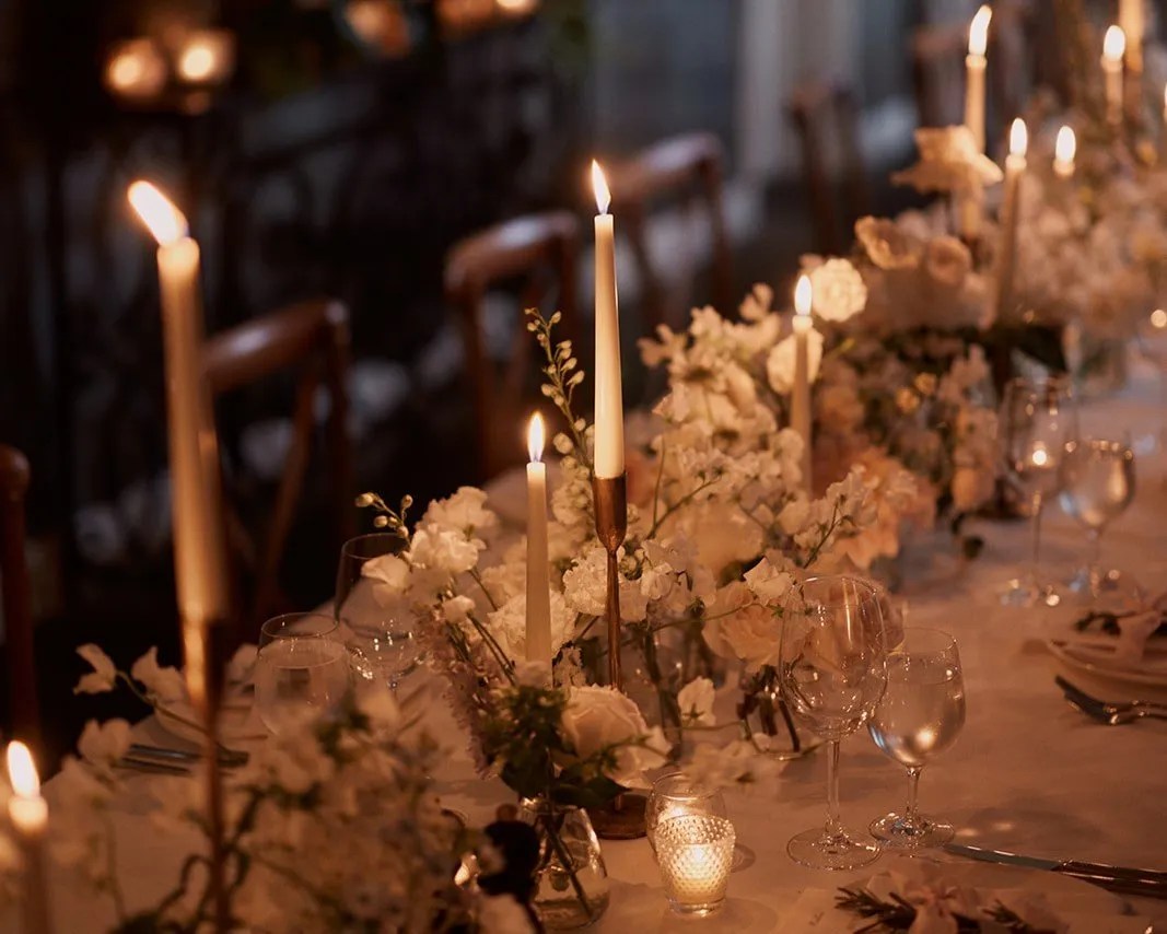 “Glass or ceramic candleholders can echo the design elements of the centerpiece, whether it’s a minimalist vibe with sleek holders or a more romantic feel with ornate, vintage-inspired designs,” she said. “The glow of candlelight ties everything together, creating an intimate and inviting atmosphere.”