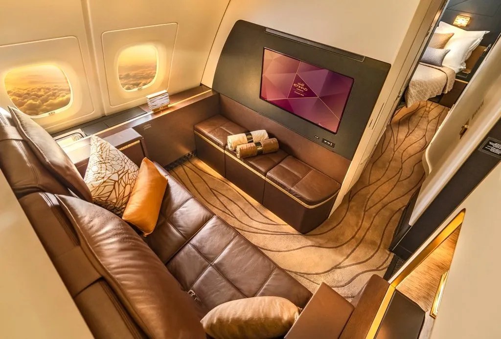 A 14-hour direct flight from New York to Abu Dhabi costs around a cool $32,000. A “normal” but still luxurious first class cabin is also available on Etihad airline.