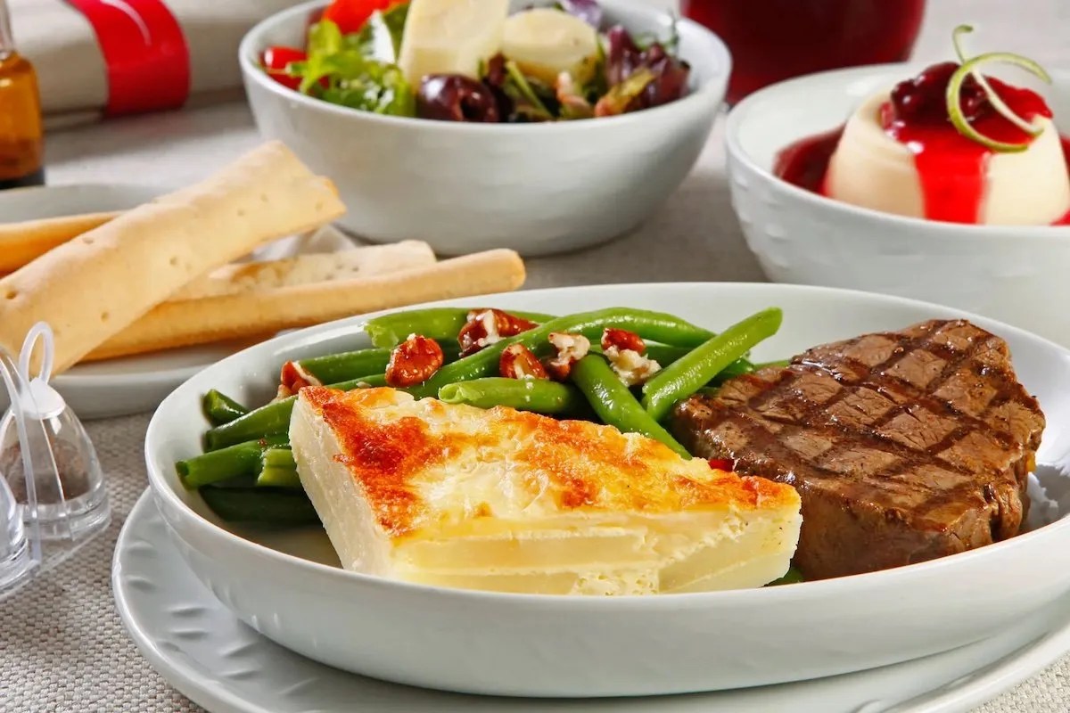 Sample a variety of appetizers, salads, and main courses, perfect for a satisfying pre-flight meal.