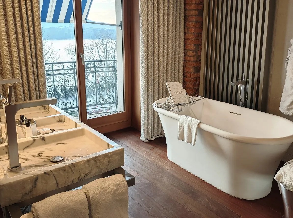 Thoughtful touches, such as Philippe Starck-designed furnishings and modern amenities, ensure a stay that is both luxurious and memorable. I particularly enjoyed the bathroom, with its amazing bathtub and stone furniture… And it also get its own balcony!